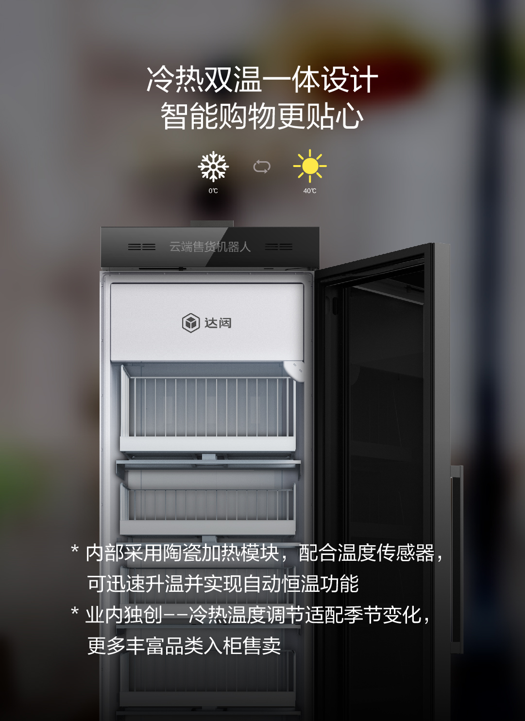 * 内部采用陶瓷加热模块,配合温度传感器,可迅速升温并实现自动恒温功能 * 业内独创--冷热温度调节适配季节变化,更多丰富品类入柜售卖
