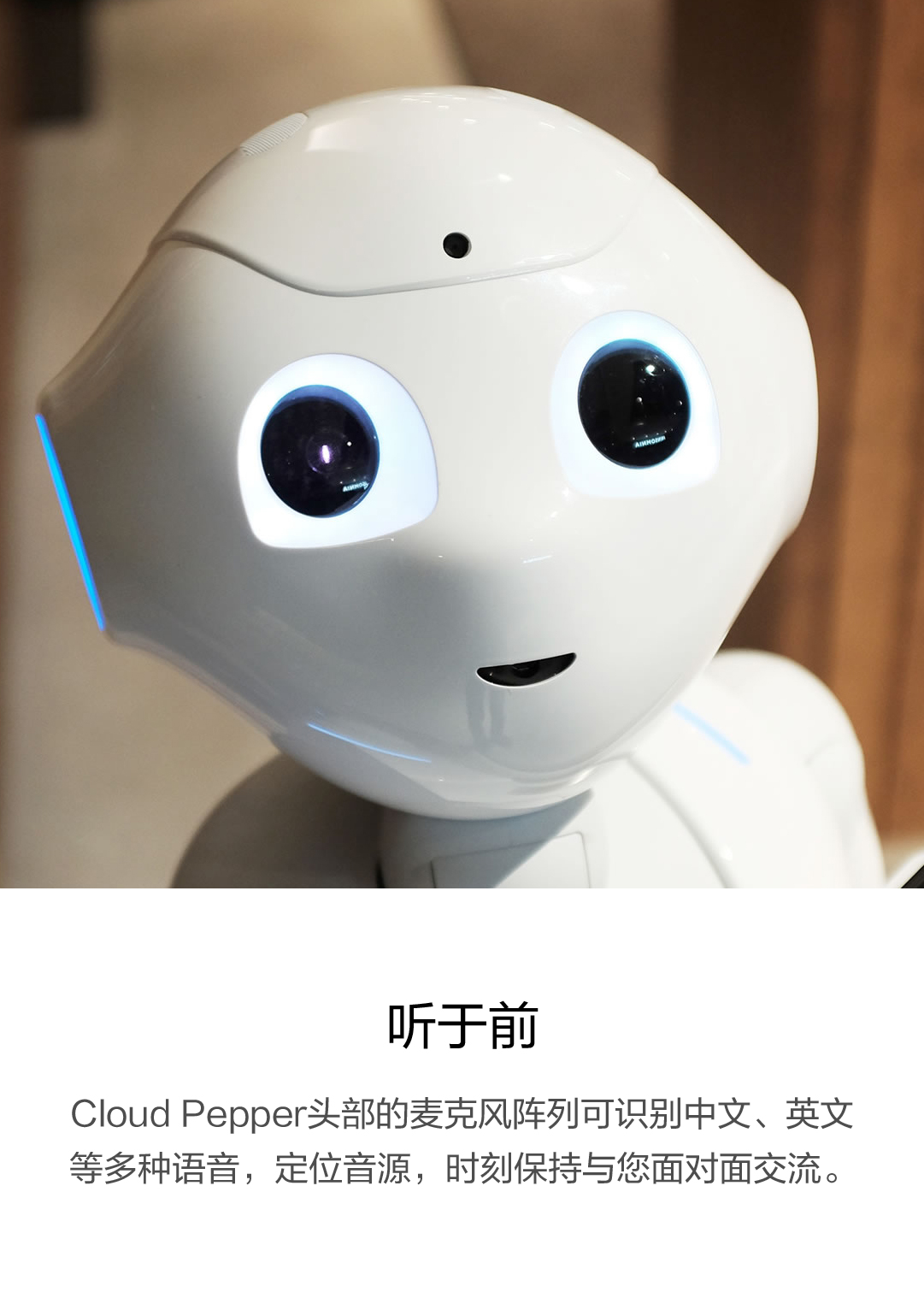 Cloud Pepper头部的麦克风阵列可识别中文、英文等多种语音,定位音源,时刻保持与您面对面交流。